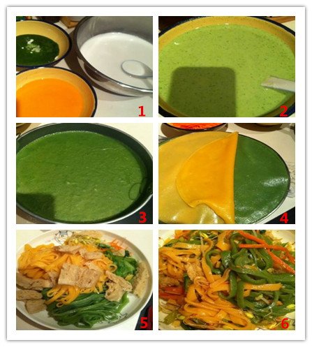2.將菠菜打成汁,倒入一份淀粉糊里。同樣做胡蘿卜的。