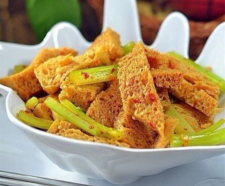 2、先將芹菜切段,面筋切小塊備用