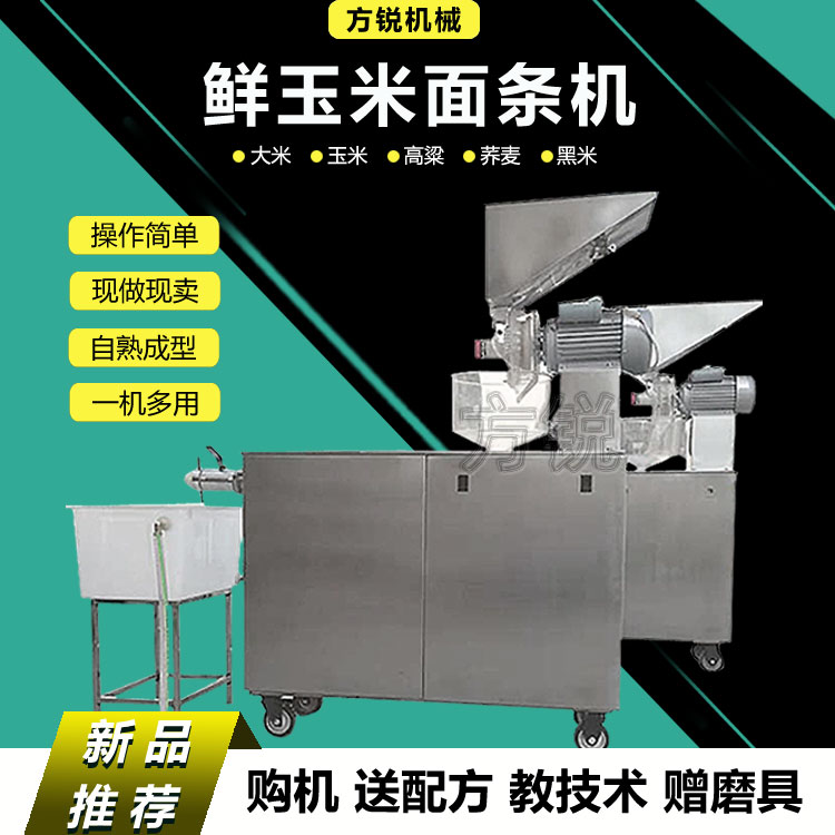 近斷時間,鄙人有幸看方銳食品機械廠觀摩制作玉米面條,首先搬來玉米粉和玉米淀粉拆帶,旁邊放著稱,對水進行了稱重,我估計是對面和水進行一定的比例要和面,之后在一臺中型和面機中進行和面,之后出來的干濕半干的玉米面,淡淡的玉米清香味,還挺不錯哦,之后將面投入一個小型的攪拌機,連接著旁邊的方銳多功能設備。